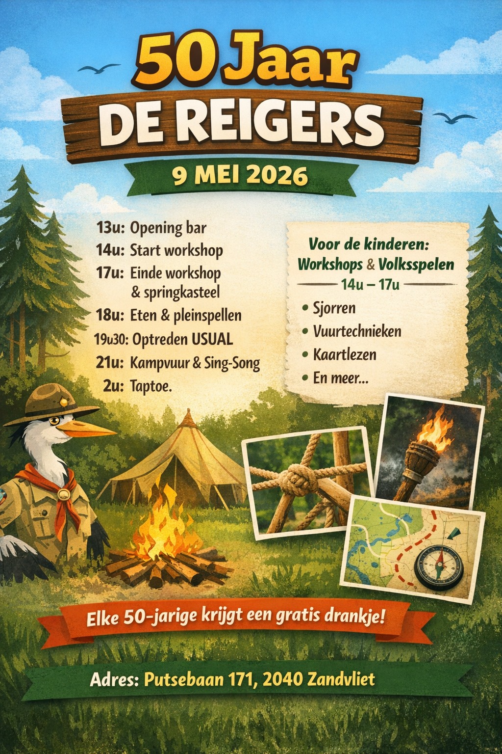 Onze scouts bestaat dit jaar 50 jaar!💐🪩 Al een halve eeuw is onze scouts een plek waar je helemaal jezelf mag zijn, je grenzen leert verleggen en samen groeit. Een plek van vriendschappen voor het leven, onvergetelijke kampen en verhalen die we blijven meedragen. Op 9 mei vieren we dit allemaal samen op ons scoutsterein. Er is randanimatie, een optreden van een topband en een kampvuurmoment zoals we dit op kamp doen. Zien we jullie daar?Meer info volgt nog